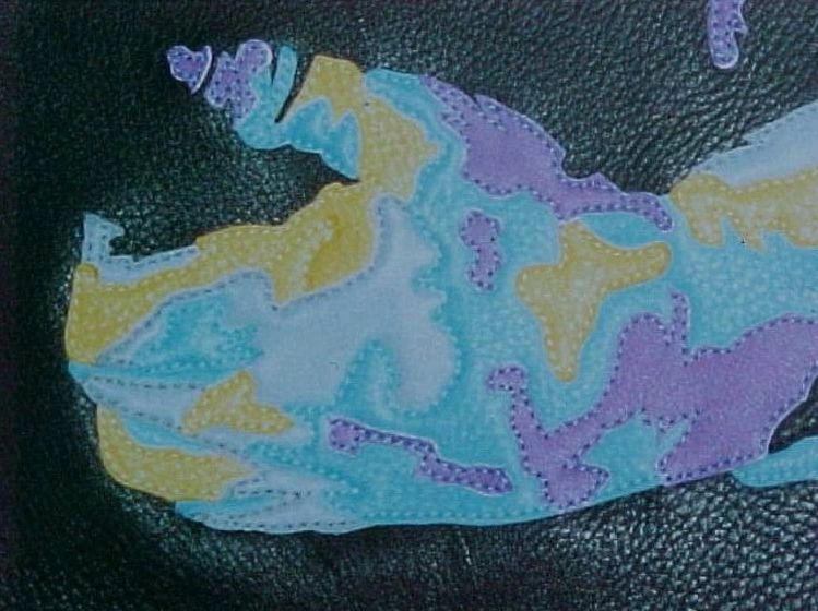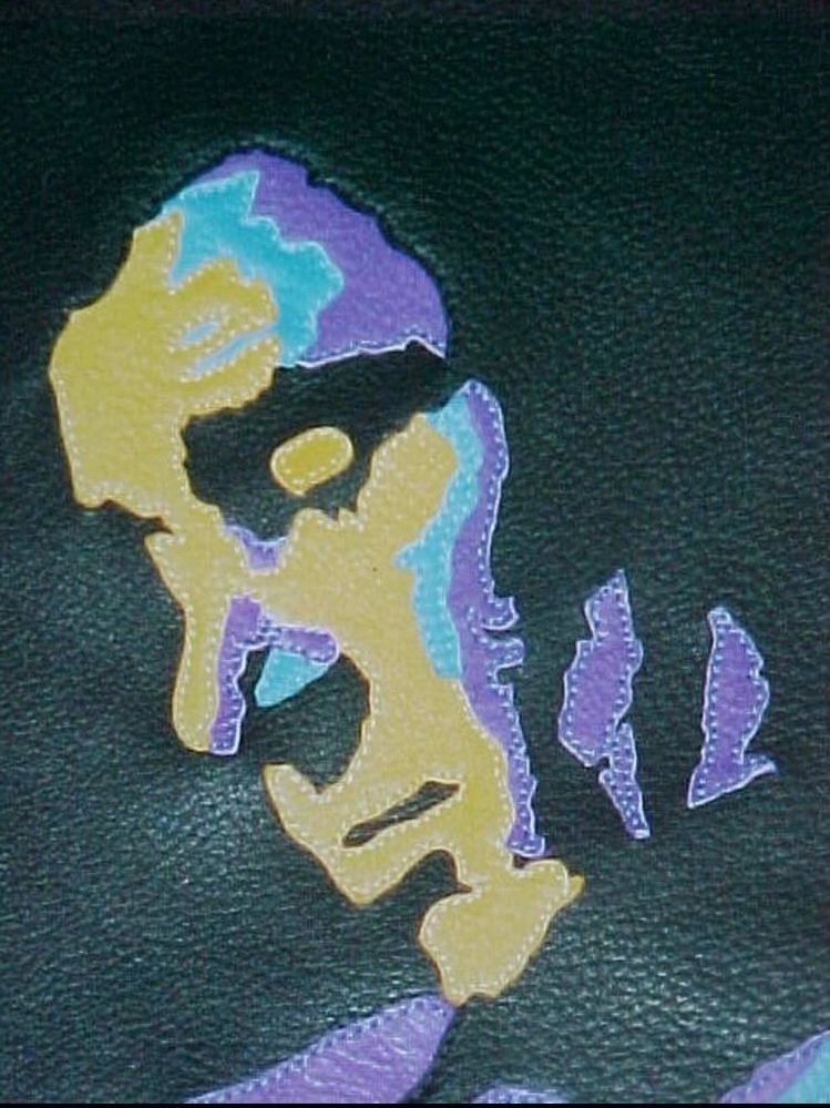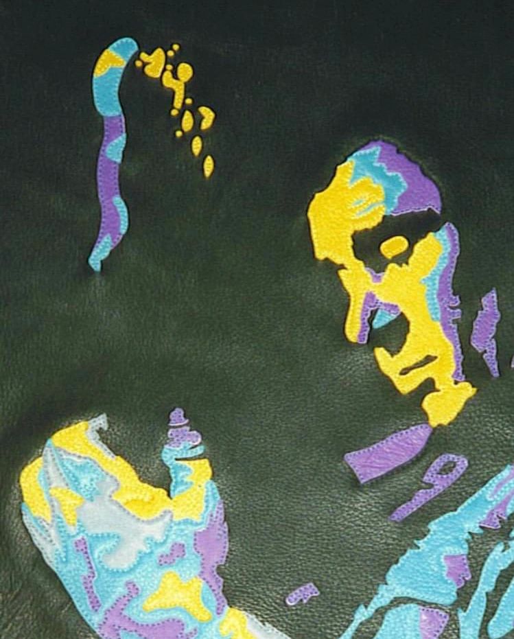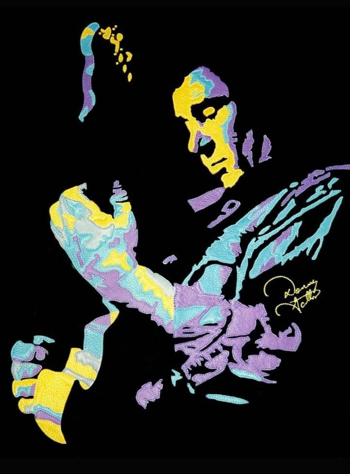 When our friend Mac Wilson asked us to consider donating a portrait for a benefit he was producing, we had no idea that the result would end up being so meaningful, but this piece really moved us. Danny Gatton - Master Musician. You've heard of the Telecaster? This man was known as the TELEMASTER! He was a virtuoso of string instruments before becoming a teenager. Danny was known for his incredible versatility and unique style of blending genres, breaking traditional boundries. He was admired by many guitar players and is still revered as one of the best who ever lived. Unfortunately, we lost him too soon. The image comes from a photograph of him performing at The Birchmere in 1990, a favorite of Danny's wife. Our initial thought was to use shades of grey to give a black and white appearance. Then we heard his music and chose the most intense colors we had! Suspended between two panes of glass, Danny is constructed almost entirely from deerskin - 115 fluidic pieces, accented with his signature in stitching. The first one was auctioned to benefit his daughter's education. The second one was commissioned by his Mother.